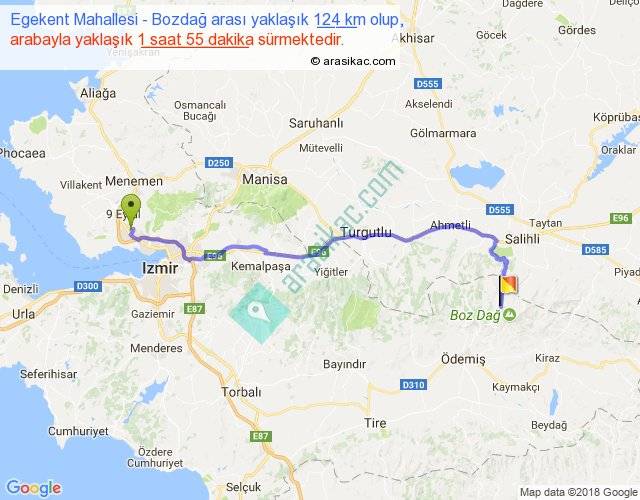 Egekent Mahallesi - Bozdağ arası yaklaşık olarak 90 km/h ile yukarıda belirtilen sürede olup, iki yerin kuş uçuşu uzaklığı (mesafesi) 90'dir. Yolculuk otobüsle 2 saat 29 dakika sürmektedir.