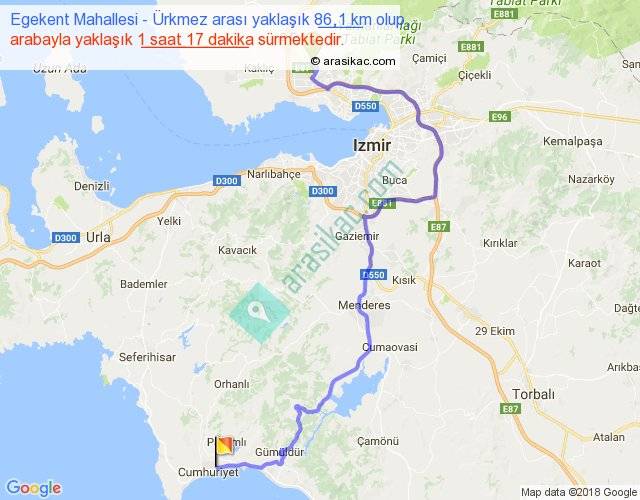 Egekent Mahallesi - Ürkmez arası yaklaşık olarak 90 km/h ile yukarıda belirtilen sürede olup, iki yerin kuş uçuşu uzaklığı (mesafesi) 49'dir. Yolculuk otobüsle 1 saat 40 dakika sürmektedir.