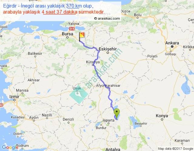 Eğirdir - İnegöl arası yaklaşık olarak 90 km/h ile yukarıda belirtilen sürede olup, iki yerin kuş uçuşu uzaklığı (mesafesi) 270'dir. Eğer belirtilen yerler arasında uçak seferi var ise bu süre uçakla 24 dakika'ya kadar düşebilir. Yolculuk otobüsle 6 saat 0 dakika sürmektedir.