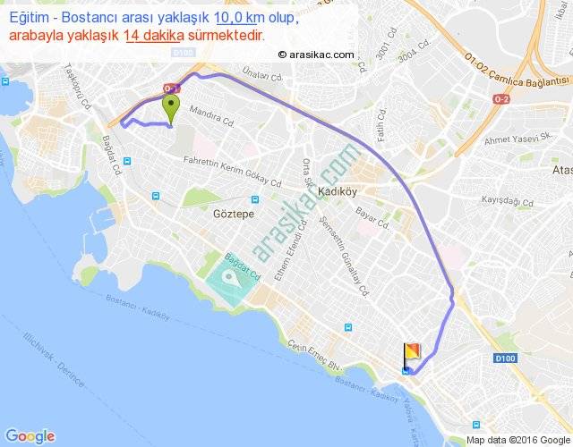 Eğitim - Bostancı arası yaklaşık olarak 90 km/h ile yukarıda belirtilen sürede olup, iki yerin kuş uçuşu uzaklığı (mesafesi) 5'dir. Yolculuk otobüsle 18 dakika sürmektedir.