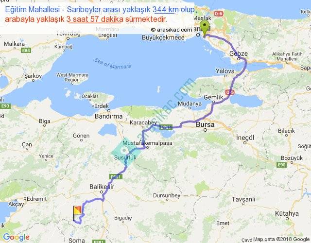 Eğitim Mahallesi - Saribeyler arası yaklaşık olarak 90 km/h ile yukarıda belirtilen sürede olup, iki yerin kuş uçuşu uzaklığı (mesafesi) 215'dir. Yolculuk otobüsle 5 saat 8 dakika sürmektedir.