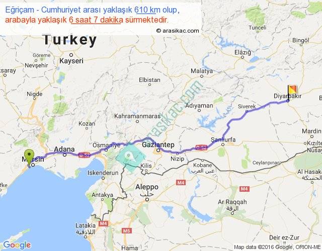 Eğriçam - Cumhuriyet arası yaklaşık olarak 90 km/h ile yukarıda belirtilen sürede olup, iki yerin kuş uçuşu uzaklığı (mesafesi) 514'dir. Eğer belirtilen yerler arasında uçak seferi var ise bu süre uçakla 47 dakika'ya kadar düşebilir. Yolculuk otobüsle 7 saat 57 dakika sürmektedir.