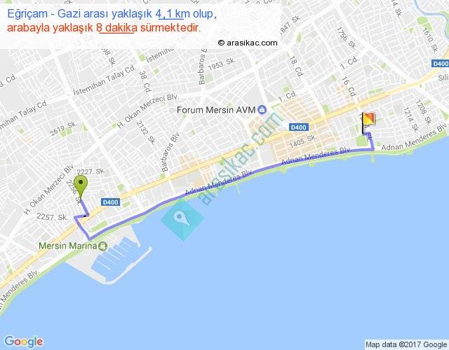 Eğriçam - Gazi arası yaklaşık olarak 90 km/h ile yukarıda belirtilen sürede olup, iki yerin kuş uçuşu uzaklığı (mesafesi) 3'dir. Yolculuk otobüsle 10 dakika sürmektedir.