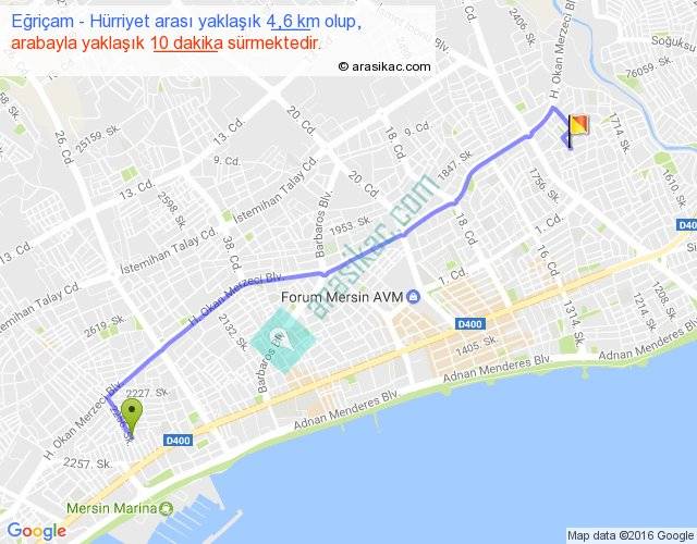 Eğriçam - Hürriyet arası yaklaşık olarak 90 km/h ile yukarıda belirtilen sürede olup, iki yerin kuş uçuşu uzaklığı (mesafesi) 4'dir. Yolculuk otobüsle 13 dakika sürmektedir.