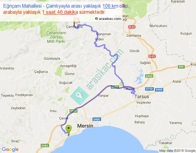 Eğriçam Mahallesi - Çamlıyayla arası yaklaşık olarak 90 km/h ile yukarıda belirtilen sürede olup, iki yerin kuş uçuşu uzaklığı (mesafesi) 43'dir. Yolculuk otobüsle 2 saat 17 dakika sürmektedir.