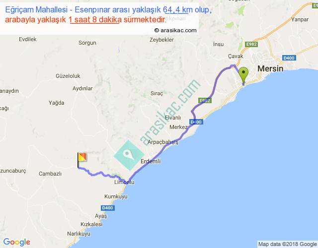 Eğriçam Mahallesi - Esenpınar arası yaklaşık olarak 90 km/h ile yukarıda belirtilen sürede olup, iki yerin kuş uçuşu uzaklığı (mesafesi) 45'dir. Yolculuk otobüsle 1 saat 28 dakika sürmektedir.