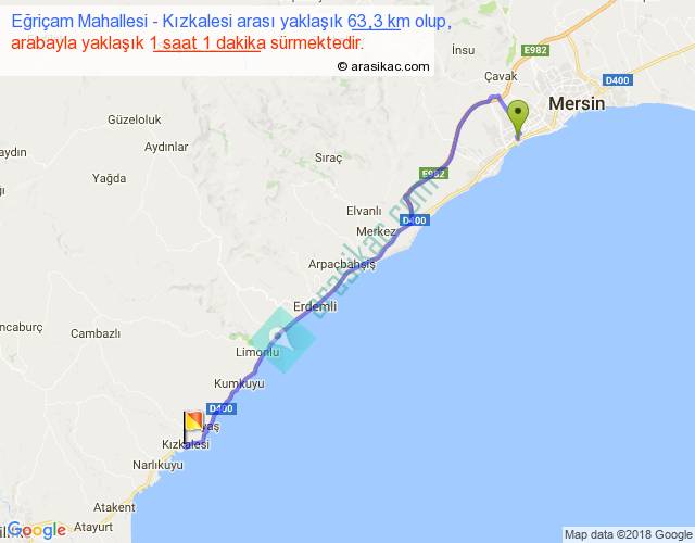 Eğriçam Mahallesi - Kızkalesi arası yaklaşık olarak 90 km/h ile yukarıda belirtilen sürede olup, iki yerin kuş uçuşu uzaklığı (mesafesi) 51'dir. Yolculuk otobüsle 1 saat 19 dakika sürmektedir.