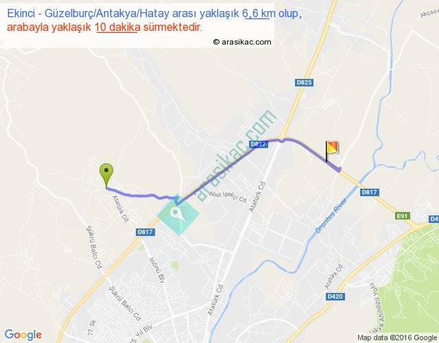Ekinci - Güzelburç Antakya Hatay arası yaklaşık olarak 90 km/h ile yukarıda belirtilen sürede olup, iki yerin kuş uçuşu uzaklığı (mesafesi) 5'dir. Yolculuk otobüsle 13 dakika sürmektedir.
