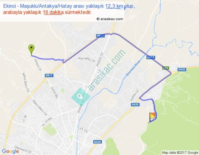 Ekinci - Maşuklu Antakya Hatay arası yaklaşık olarak 90 km/h ile yukarıda belirtilen sürede olup, iki yerin kuş uçuşu uzaklığı (mesafesi) 7'dir. Yolculuk otobüsle 20 dakika sürmektedir.