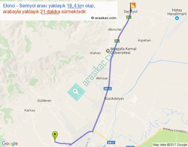 Ekinci - Serinyol arası yaklaşık olarak 90 km/h ile yukarıda belirtilen sürede olup, iki yerin kuş uçuşu uzaklığı (mesafesi) 16'dir. Yolculuk otobüsle 27 dakika sürmektedir.