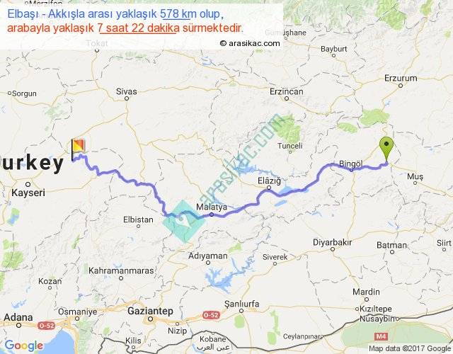 Elbaşı - Akkışla arası yaklaşık olarak 90 km/h ile yukarıda belirtilen sürede olup, iki yerin kuş uçuşu uzaklığı (mesafesi) 418'dir. Eğer belirtilen yerler arasında uçak seferi var ise bu süre uçakla 38 dakika'ya kadar düşebilir. Yolculuk otobüsle 9 saat 34 dakika sürmektedir.