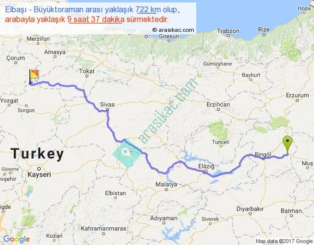 Elbaşı - Büyüktoraman arası yaklaşık olarak 90 km/h ile yukarıda belirtilen sürede olup, iki yerin kuş uçuşu uzaklığı (mesafesi) 508'dir. Eğer belirtilen yerler arasında uçak seferi var ise bu süre uçakla 46 dakika'ya kadar düşebilir. Yolculuk otobüsle 12 saat 30 dakika sürmektedir.