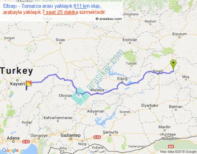 Elbaşı - Tomarza arası yaklaşık olarak 90 km/h ile yukarıda belirtilen sürede olup, iki yerin kuş uçuşu uzaklığı (mesafesi) 456'dir. Eğer belirtilen yerler arasında uçak seferi var ise bu süre uçakla 42 dakika'ya kadar düşebilir. Yolculuk otobüsle 9 saat 38 dakika sürmektedir.