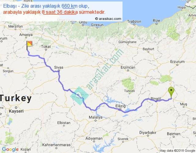 Elbaşı - Zile arası yaklaşık olarak 90 km/h ile yukarıda belirtilen sürede olup, iki yerin kuş uçuşu uzaklığı (mesafesi) 462'dir. Eğer belirtilen yerler arasında uçak seferi var ise bu süre uçakla 42 dakika'ya kadar düşebilir. Yolculuk otobüsle 11 saat 10 dakika sürmektedir.