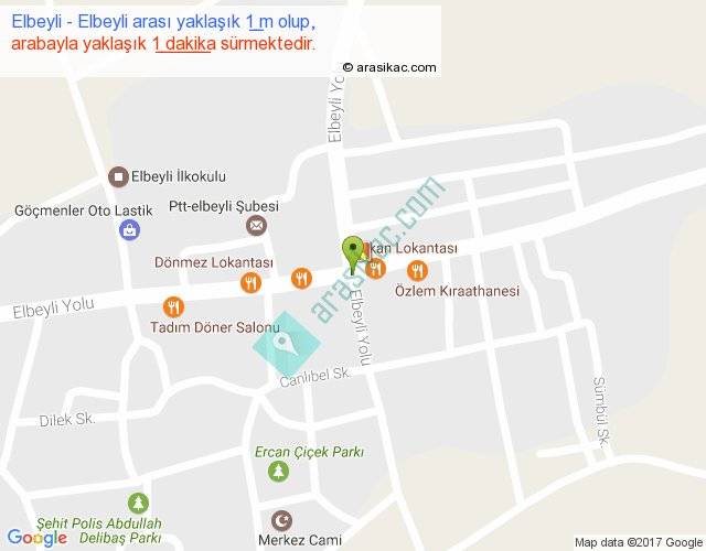 Elbeyli - Elbeyli arası yaklaşık olarak 90 km/h ile yukarıda belirtilen sürede olup, iki yerin kuş uçuşu uzaklığı (mesafesi) 0'dir. Yolculuk otobüsle 1 dakika sürmektedir.