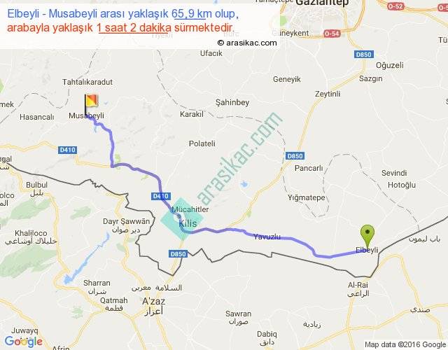 Elbeyli - Musabeyli arası yaklaşık olarak 90 km/h ile yukarıda belirtilen sürede olup, iki yerin kuş uçuşu uzaklığı (mesafesi) 54'dir. Yolculuk otobüsle 1 saat 20 dakika sürmektedir.