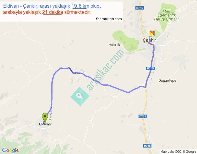 Eldivan - Çankırı arası yaklaşık olarak 90 km/h ile yukarıda belirtilen sürede olup, iki yerin kuş uçuşu uzaklığı (mesafesi) 13'dir. Yolculuk otobüsle 27 dakika sürmektedir.
