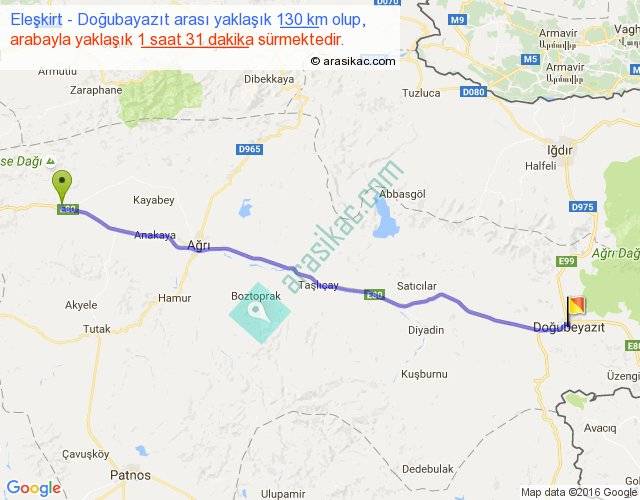 Eleşkirt - Doğubayazıt arası yaklaşık olarak 90 km/h ile yukarıda belirtilen sürede olup, iki yerin kuş uçuşu uzaklığı (mesafesi) 122'dir. Yolculuk otobüsle 1 saat 58 dakika sürmektedir.