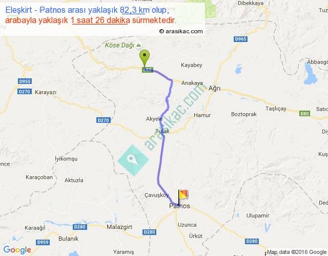 Eleşkirt - Patnos arası yaklaşık olarak 90 km/h ile yukarıda belirtilen sürede olup, iki yerin kuş uçuşu uzaklığı (mesafesi) 65'dir. Yolculuk otobüsle 1 saat 51 dakika sürmektedir.