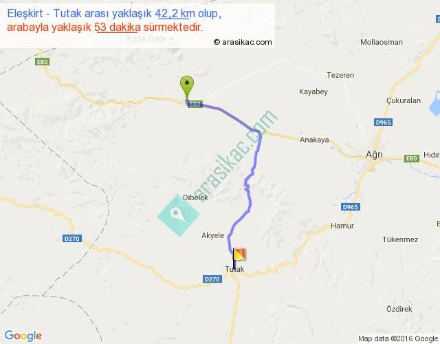 Eleşkirt - Tutak arası yaklaşık olarak 90 km/h ile yukarıda belirtilen sürede olup, iki yerin kuş uçuşu uzaklığı (mesafesi) 30'dir. Yolculuk otobüsle 1 saat 8 dakika sürmektedir.