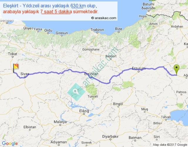 Eleşkirt - Yıldızeli arası yaklaşık olarak 90 km/h ile yukarıda belirtilen sürede olup, iki yerin kuş uçuşu uzaklığı (mesafesi) 516'dir. Eğer belirtilen yerler arasında uçak seferi var ise bu süre uçakla 47 dakika'ya kadar düşebilir. Yolculuk otobüsle 9 saat 12 dakika sürmektedir.