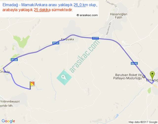 Elmadağ - Mamak Ankara arası yaklaşık olarak 90 km/h ile yukarıda belirtilen sürede olup, iki yerin kuş uçuşu uzaklığı (mesafesi) 14'dir. Yolculuk otobüsle 32 dakika sürmektedir.