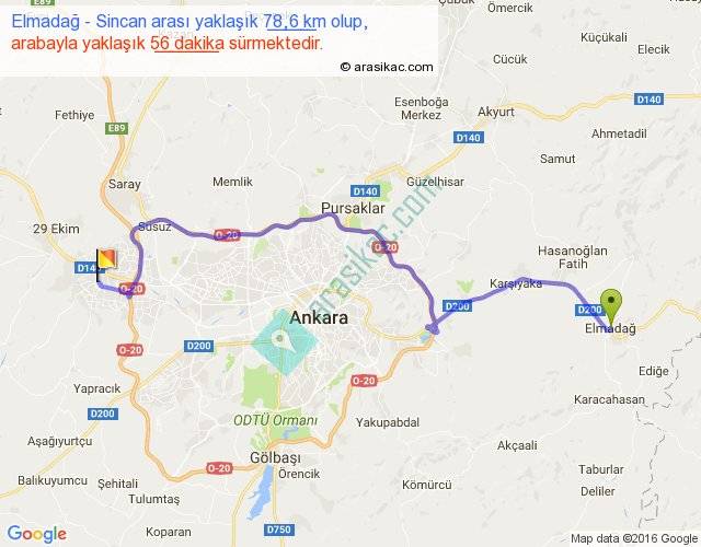 Elmadağ - Sincan arası yaklaşık olarak 90 km/h ile yukarıda belirtilen sürede olup, iki yerin kuş uçuşu uzaklığı (mesafesi) 55'dir. Yolculuk otobüsle 1 saat 12 dakika sürmektedir.
