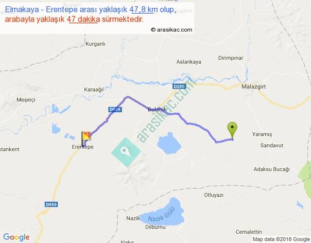 Elmakaya - Erentepe arası yaklaşık olarak 90 km/h ile yukarıda belirtilen sürede olup, iki yerin kuş uçuşu uzaklığı (mesafesi) 36'dir. Yolculuk otobüsle 1 saat 1 dakika sürmektedir.