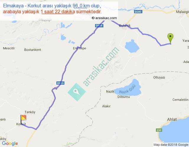Elmakaya - Korkut arası yaklaşık olarak 90 km/h ile yukarıda belirtilen sürede olup, iki yerin kuş uçuşu uzaklığı (mesafesi) 68'dir. Yolculuk otobüsle 1 saat 46 dakika sürmektedir.