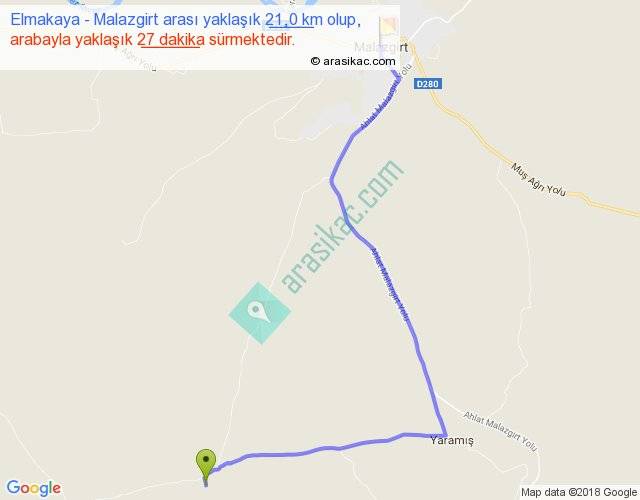 Elmakaya - Malazgirt arası yaklaşık olarak 90 km/h ile yukarıda belirtilen sürede olup, iki yerin kuş uçuşu uzaklığı (mesafesi) 14'dir. Yolculuk otobüsle 35 dakika sürmektedir.