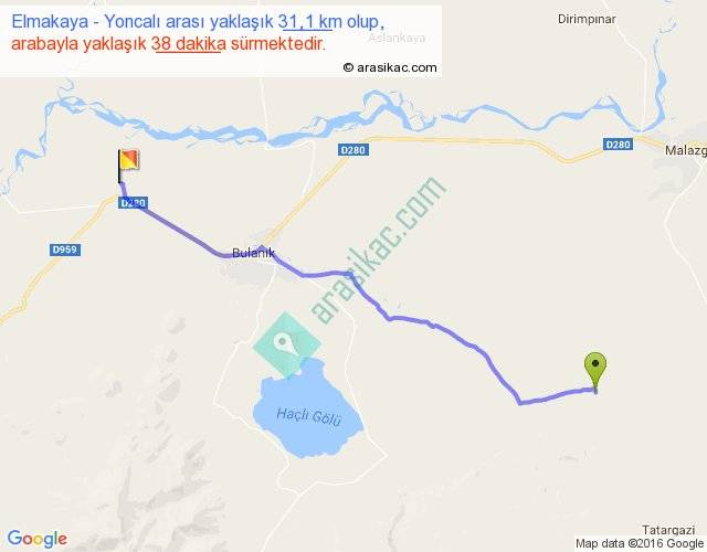 Elmakaya - Yoncalı arası yaklaşık olarak 90 km/h ile yukarıda belirtilen sürede olup, iki yerin kuş uçuşu uzaklığı (mesafesi) 28'dir. Yolculuk otobüsle 49 dakika sürmektedir.