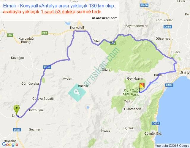 Elmalı - Konyaaltı Antalya arası yaklaşık olarak 90 km/h ile yukarıda belirtilen sürede olup, iki yerin kuş uçuşu uzaklığı (mesafesi) 51'dir. Yolculuk otobüsle 2 saat 26 dakika sürmektedir.