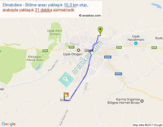 Elmalıdere - Bölme arası yaklaşık olarak 90 km/h ile yukarıda belirtilen sürede olup, iki yerin kuş uçuşu uzaklığı (mesafesi) 9'dir. Yolculuk otobüsle 27 dakika sürmektedir.