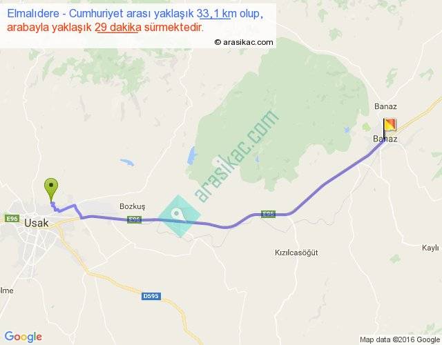 Elmalıdere - Cumhuriyet arası yaklaşık olarak 90 km/h ile yukarıda belirtilen sürede olup, iki yerin kuş uçuşu uzaklığı (mesafesi) 29'dir. Yolculuk otobüsle 37 dakika sürmektedir.