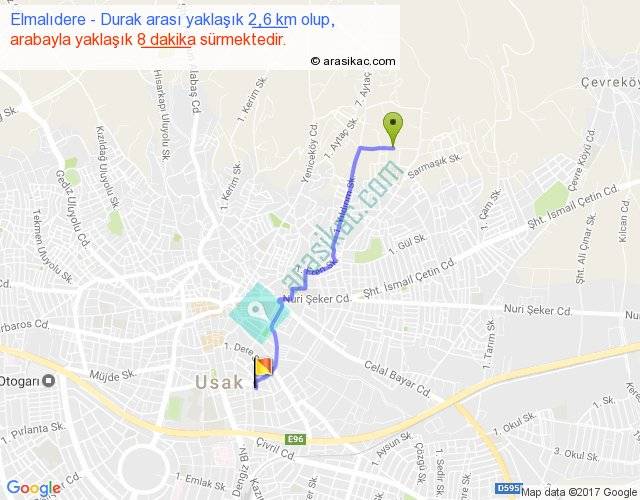 Elmalıdere - Durak arası yaklaşık olarak 90 km/h ile yukarıda belirtilen sürede olup, iki yerin kuş uçuşu uzaklığı (mesafesi) 2'dir. Yolculuk otobüsle 10 dakika sürmektedir.