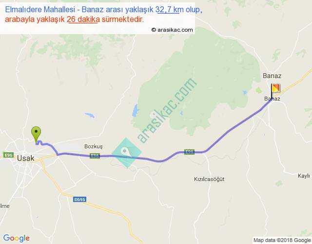 Elmalıdere Mahallesi - Banaz arası yaklaşık olarak 90 km/h ile yukarıda belirtilen sürede olup, iki yerin kuş uçuşu uzaklığı (mesafesi) 29'dir. Yolculuk otobüsle 33 dakika sürmektedir.