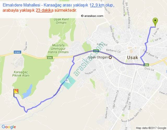 Elmalıdere Mahallesi - Karaağaç arası yaklaşık olarak 90 km/h ile yukarıda belirtilen sürede olup, iki yerin kuş uçuşu uzaklığı (mesafesi) 9'dir. Yolculuk otobüsle 29 dakika sürmektedir.