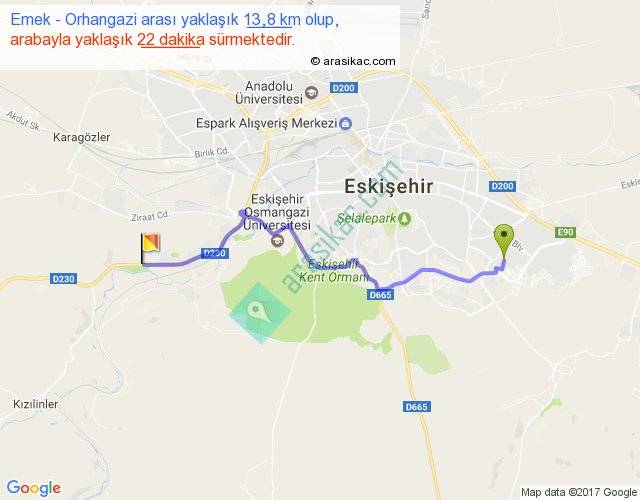 Emek - Orhangazi arası yaklaşık olarak 90 km/h ile yukarıda belirtilen sürede olup, iki yerin kuş uçuşu uzaklığı (mesafesi) 11'dir. Yolculuk otobüsle 28 dakika sürmektedir.
