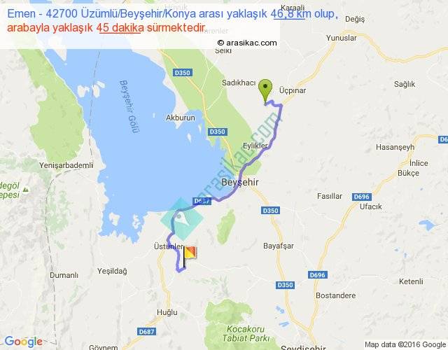 Emen - 42700 Üzümlü Beyşehir Konya arası yaklaşık olarak 90 km/h ile yukarıda belirtilen sürede olup, iki yerin kuş uçuşu uzaklığı (mesafesi) 31'dir. Yolculuk otobüsle 58 dakika sürmektedir.