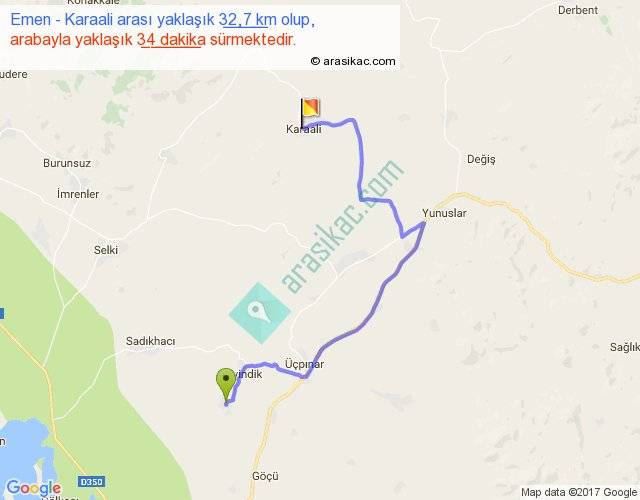 Emen - Karaali arası yaklaşık olarak 90 km/h ile yukarıda belirtilen sürede olup, iki yerin kuş uçuşu uzaklığı (mesafesi) 17'dir. Yolculuk otobüsle 44 dakika sürmektedir.