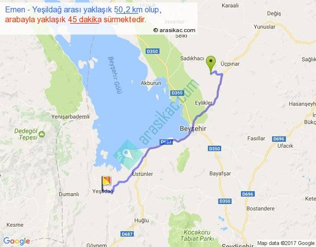 Emen - Yeşildağ arası yaklaşık olarak 90 km/h ile yukarıda belirtilen sürede olup, iki yerin kuş uçuşu uzaklığı (mesafesi) 39'dir. Yolculuk otobüsle 58 dakika sürmektedir.