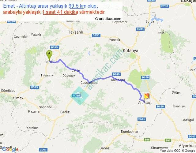 Emet - Altıntaş arası yaklaşık olarak 90 km/h ile yukarıda belirtilen sürede olup, iki yerin kuş uçuşu uzaklığı (mesafesi) 79'dir. Yolculuk otobüsle 2 saat 11 dakika sürmektedir.