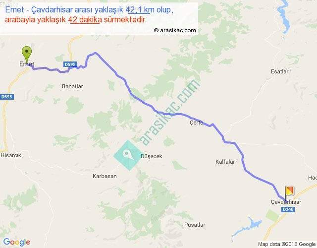 Emet - Çavdarhisar arası yaklaşık olarak 90 km/h ile yukarıda belirtilen sürede olup, iki yerin kuş uçuşu uzaklığı (mesafesi) 35'dir. Yolculuk otobüsle 54 dakika sürmektedir.