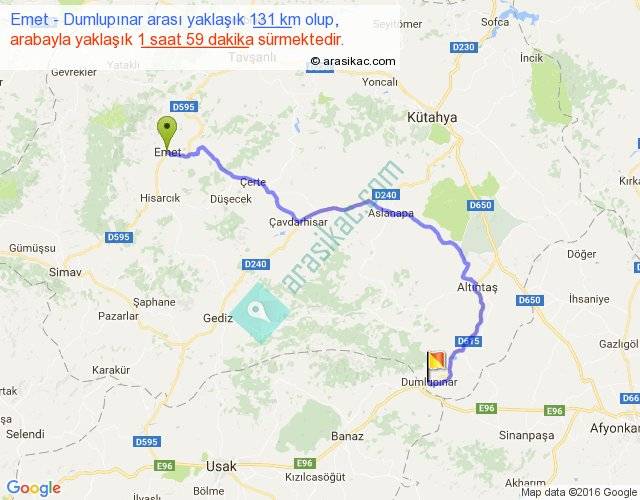 Emet - Dumlupınar arası yaklaşık olarak 90 km/h ile yukarıda belirtilen sürede olup, iki yerin kuş uçuşu uzaklığı (mesafesi) 82'dir. Yolculuk otobüsle 2 saat 36 dakika sürmektedir.