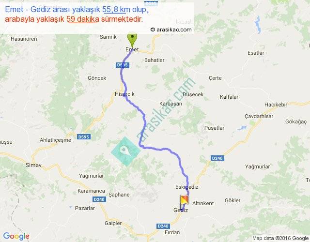 Emet - Gediz arası yaklaşık olarak 90 km/h ile yukarıda belirtilen sürede olup, iki yerin kuş uçuşu uzaklığı (mesafesi) 41'dir. Yolculuk otobüsle 1 saat 16 dakika sürmektedir.