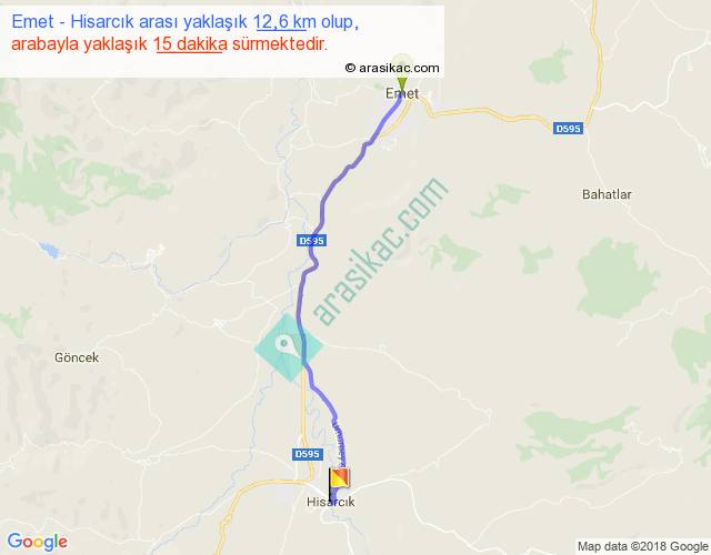 Emet - Hisarcık arası yaklaşık olarak 90 km/h ile yukarıda belirtilen sürede olup, iki yerin kuş uçuşu uzaklığı (mesafesi) 11'dir. Yolculuk otobüsle 18 dakika sürmektedir.