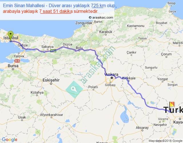 Emin Sinan Mahallesi - Düver arası yaklaşık olarak 90 km/h ile yukarıda belirtilen sürede olup, iki yerin kuş uçuşu uzaklığı (mesafesi) 565'dir. Eğer belirtilen yerler arasında uçak seferi var ise bu süre uçakla 52 dakika'ya kadar düşebilir. Yolculuk otobüsle 10 saat 12 dakika sürmektedir.