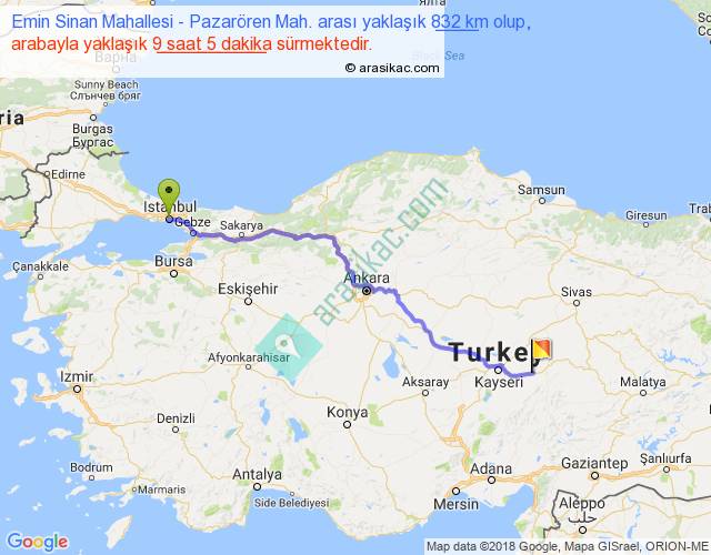 Emin Sinan Mahallesi - Pazarören Mah. arası yaklaşık olarak 90 km/h ile yukarıda belirtilen sürede olup, iki yerin kuş uçuşu uzaklığı (mesafesi) 662'dir. Eğer belirtilen yerler arasında uçak seferi var ise bu süre uçakla 1 saat 01 dakika'ya kadar düşebilir. Yolculuk otobüsle 11 saat 48 dakika sürmektedir.