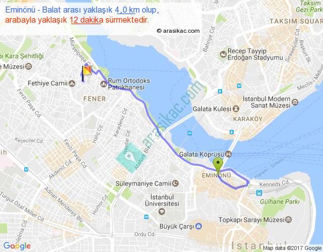 Eminönü - Balat arası yaklaşık olarak 90 km/h ile yukarıda belirtilen sürede olup, iki yerin kuş uçuşu uzaklığı (mesafesi) 2'dir. Yolculuk otobüsle 15 dakika sürmektedir.