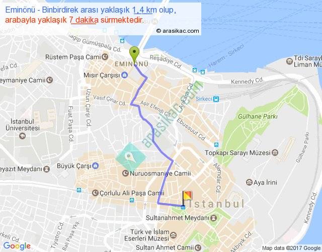 Eminönü - Binbirdirek arası yaklaşık olarak 90 km/h ile yukarıda belirtilen sürede olup, iki yerin kuş uçuşu uzaklığı (mesafesi) 1'dir. Yolculuk otobüsle 9 dakika sürmektedir.